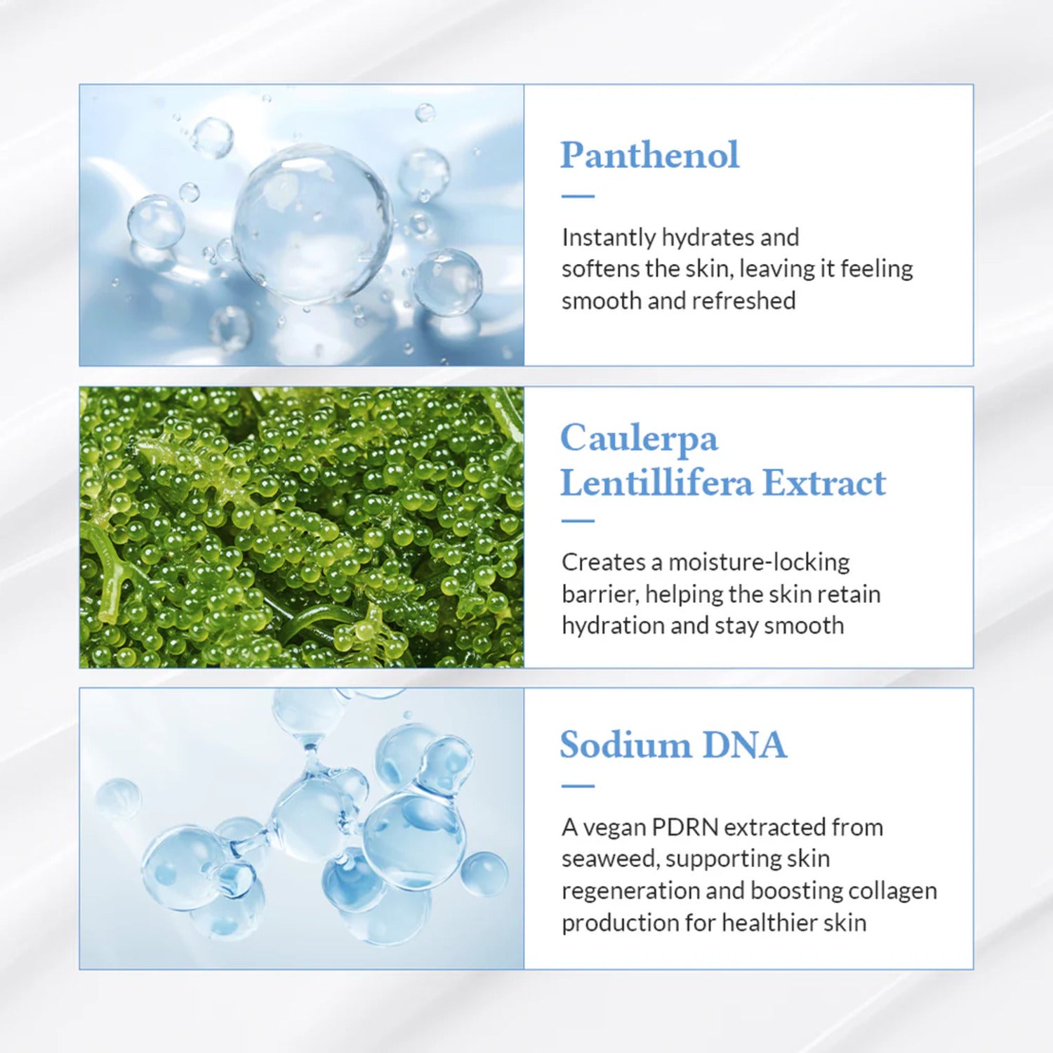 Caulerpa Lentillifera (Sea Grape) Extract — Rich in minerals and antioxidants, it helps replenish and lock in hydration for long-lasting suppleness.